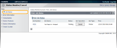 Klik [Job Number] untuk memaparkan maklumat terperinci tentang dokumen. Sebagai contoh, anda boleh memeriksa nama pengguna dan kiraan halaman cetakan dokumen.