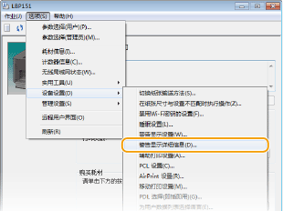 | 禁用消息显示可按以下操作禁用 <需要尽快更换墨粉盒。> 消息的显示:选择“打印机状态窗口”的 [选项] 菜单  [设备设置]  清除 [显示墨粉盒更换通知] 对话框中的 [警告显示设置] 复选框。 |
