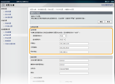 ![]() | 本机的 IPv4 地址可通过 DHCP 等动态 IP 寻址协议自动分配或手动输入。将本机连接至有线局域网时,请确保局域网电缆的接头牢牢插入端口(连接有线局域网)。 |
