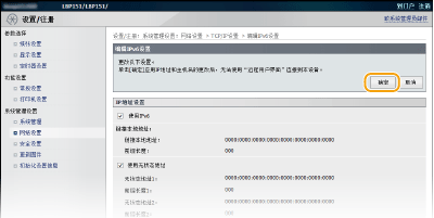 | 通过远程用户界面设置 IPv6 地址。设置 IPv6 地址前,请确保已正确设置 IPv4 地址( 查看网络设置)。您最多可注册 9 个如下文所示的 IPv6 地址。 |