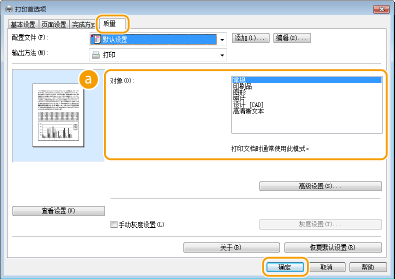 若要为在 [对象] 中选择的每个项目指定详细设置,请单击 [高级设置]。更多信息,请单击打印机驱动程序画面上的 [帮助]。