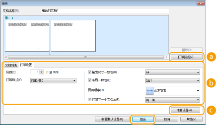 [详细设置]显示打印机驱动程序的打印设置画面。可用设置比使用普通打印方法时的设置更少。