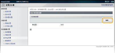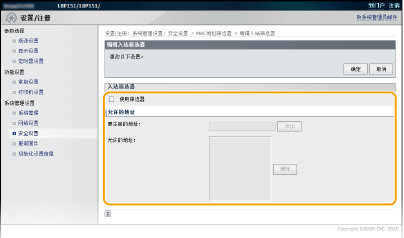 2 | 指定例外地址。 在 [要注册的地址] 文本框中输入 MAC 地址并单击 [添加]。仅允许与具有注册 MAC 地址的设备通信(接收),限制与具有任何其他 MAC 地址的设备通信。 输入地址时,请勿用连字符或冒号分隔。 ![]() 要删除已设置的 MAC 地址 选择要删除的 MAC 地址,然后单击 [删除]。 ![]() |