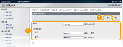 3 | 设置用户名/密码,然后单击 [确定]。 [用户名] 为用户名输入最多 24 个字母数字字符。 [更改密码] 若要设置或更改密码,请勾选此复选框并在 [密码] 和 [确认] 文本框中输入最多 24 个字母数字字符的新密码。 |