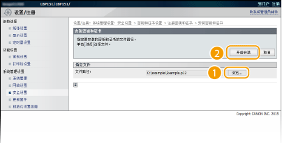 可从认证机构 (CA) 获取用于本机使用的密钥对和数字证书。从认证机构获取密钥和证书后,可通过远程用户界面在本机上安装并注册密钥对和 CA 证书。请确保密钥对和证书满足本机的要求(
