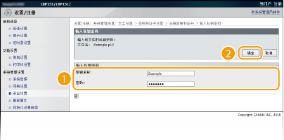 2 | 输入密钥对名称和密码,然后单击 [确定]。 [密钥名称] 输入在本机注册的密钥对名称(最多 24 个字母数字字符)。请设置方便以后在列表中查找的名称。 [密码] 输入最多 24 个字母数字字符,作为待注册文件的私钥密码。 |