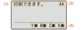 (2) | 給紙元、用紙サイズ欄 | 現在選択している給紙元の用紙サイズを表示します。次の用紙サイズは略称で表示します。(レジャー:LD、リーガル:LG、レター:LT、レターR:LTR、エグゼクティブ:EX、12 × 18:TxE、はがき:HG、往復はがき:H2、4 面はがき:H4、長形 3 号:N3、洋形長 3 号:YN3、角形 2 号:K2、ユーザー設定用紙R:80R ~ 99R、ユーザー設定用紙:80 ~ 99、フリー:FR) |