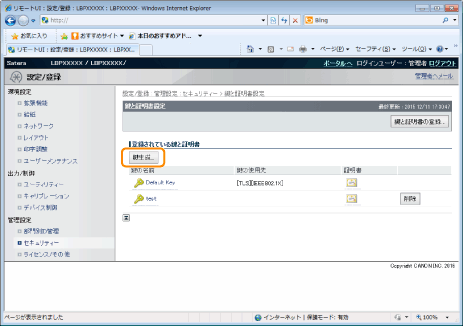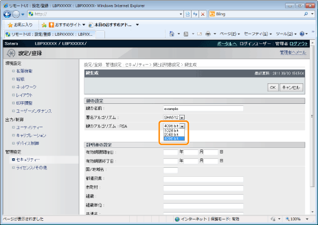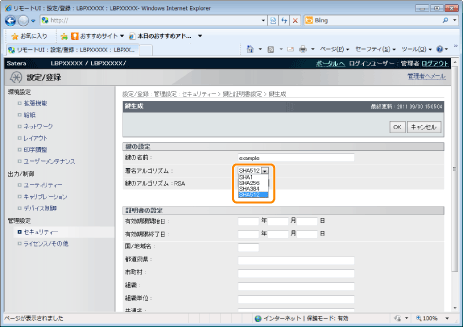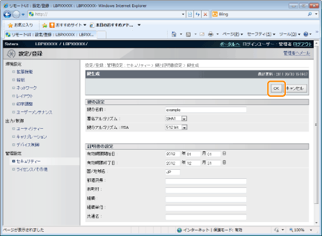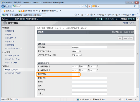 自己署名型サーバー証明書を発行するために[国/地域名]、[都道府県]、[市町村]、[組織]、[組織単位]、[共通名]のうち、少なくとも1つの項目は設定してください。 全項目が空白の場合、自己署名型サーバー証明書は発行されません。 Windows Vista/7/8/8.1/10/Server 2008/Server 2012/Server 2012 R2をお使いのとき[共通名]はIPPSで接続するときに指定する名前(FQDN)またはIPアドレスと一致している必要があります。 FQDNなら[共通名]はFQDNを入力 IPアドレスなら[共通名]はIPアドレスを入力 |