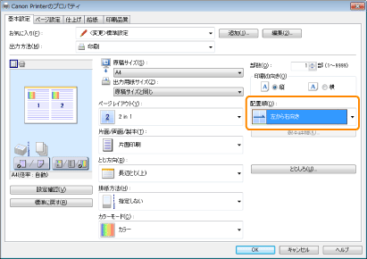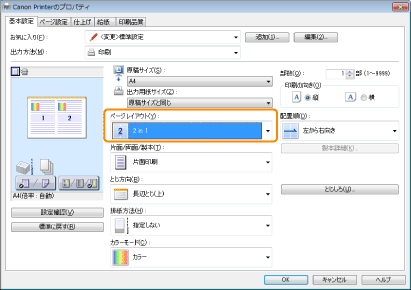 この機能は、[ページ設定]タブでも設定できます。 本機能をお使いの場合、任意の倍率で拡大/縮小できません。 本機能をお使いの場合、アプリケーションソフトウェア側で部単位で印刷する設定をすると、正しく印刷できないことがあります。 お使いのOS、プリンタードライバーの種類およびバージョンによって画面が異なることがあります。 |
