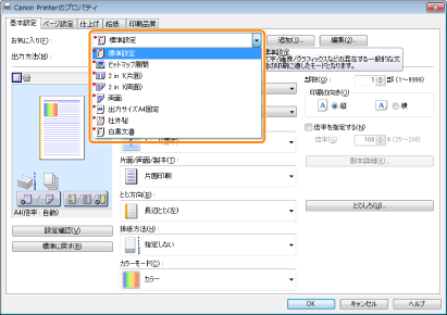 印刷設定画面の表示方法については、「印刷する」または「あらかじめ印刷の設定をする」を参照してください。 |
