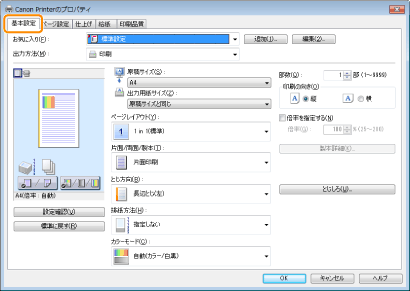 この機能は、[印刷品質]タブでも設定できます。 お使いのOS、プリンタードライバーの種類およびバージョンによって画面が異なることがあります。 |