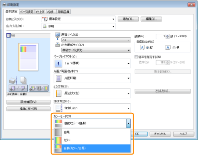 [自動(カラー/白黒)]を選択すると、ページ単位で判断して、カラー印刷/白黒印刷を自動で切り替えます。