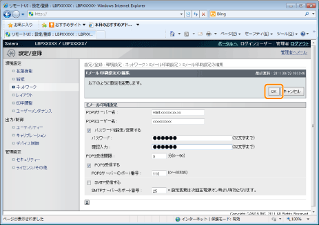 [POP3サーバーのポート番号] | Eメールを受信するサーバーのポート番号を設定します。 ポート番号は[0]から[65535]まで設定可能です。 |