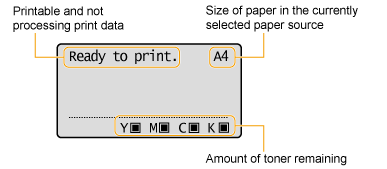 If no abnormality is found during the self-diagnostic test, the Main Power indicator (green), Ready indicator (green), Online indicator (green) and Paper Source indicator (green) come on, <Ready to print.> appears in the display, and the printer is ready to print. | |
