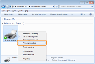 Right-click the icon of the printer whose settings you want to specify → click [Properties] (or [Printer properties]).