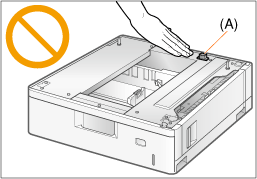 Protecting the printer from condensationTo prevent condensation from forming inside the printer in the following cases, adjust the printer to the ambient temperature and humidity for at least two hours before use. When the room where the printer is installed is heated rapidly When the printer is moved from a cool or dry location to a hot or humid location If water droplets (condensation) form inside the printer, this can result in paper jams or poor print quality. Precautions for the power supplyUse an AC power outlet exclusively for the printer. Do not use the other sockets of the AC power outlet. Do not plug the power plug in the auxiliary outlet on a computer. Do not use the same AC power outlet for both the printer and any of the following equipment. Copy machine Air conditioner Shredder Equipment that consumes a large amount of electricity Equipment that generates electrical noise The maximum power consumption of the printer is 1,420 W or less. Electrical noise or a dramatic drop in mains voltage may cause the printer or computer to operate incorrectly or lose data. If you have any questions regarding your power supply, contact your power company or your nearest electronics store. Do not install the printer in the following locations, as this may result in damage to the printer.A location subject to dramatic changes in temperature or humidity A location subject to condensation A poorly ventilated location (If you use the printer for a long time or to perform a large amount of printing in a poorly ventilated room, the ozone or other odors generated by the printer may create an uncomfortable working environment. In addition, chemical particles are dispersed during printing. Therefore, it is important to provide adequate ventilation. Also avoid locations where people would be exposed to emissions from the machine). A location near equipment that generates magnetic or electromagnetic waves A laboratory or location where chemical reactions occur A location exposed to salt air, corrosive gases, or toxic gases A location, such as on a carpet or mat, that may warp from the weight of the printer or where the printer is liable to sink Precautions when preparing the toner cartridgeSee "Attention (Toner Cartridge)." Precautions when connecting the power cordDo not plug the power plug of the printer into an auxiliary outlet on a computer. One AC power outlet should be used exclusively for the printer. Do not connect this printer to an uninterruptible power source. This may cause printer malfunction or breakdown in the event of a power failure. When turning ON the printer for the first time after the printer installationBefore turning ON the printer, be sure to insert the paper drawer in the printer. Although a sheet of blank paper may be output, this is not an error. Precautions when installing the paper feederDo not touch the connector (A) on the paper feeder. This may result in damage to the printer or misfeeds. ![]() If you cannot place the printer on the paper feeder properly, lift the printer once, hold it horizontally, and place it again. If you try to place the printer forcefully without lifting it, the connector and positioning pins may be broken. Be sure to turn the printer ON once when loading paper in the paper drawer for the first time after installing the paper feeder. Precautions when installing/removing ROMBe sure not to touch the switches on the main board. If you change the switches, the printer does not operate properly. Observe the following precautions when handling ROM to prevent damage from static electricity. Touch a metal object to dissipate static electricity before handling them. When handling ROM, do not touch anything that generates static electricity such as the computer display. Do not touch the main board parts, printed wire, or connectors with your hands. Take ROM out of the protective bag right before it is installed. When installing ROM, be careful so that any metal objects such as screws do not touch the main board. Do not directly touch parts on the main board, the printed circuits, or the connectors with your hands. If any of screws, clips, staples, and so on should drop inside the printer, do not plug the power plug in the AC power outlet and contact your local authorized Canon dealer. Do not turn the printer ON without the slot cover attached. This may result in damage to the printer. |