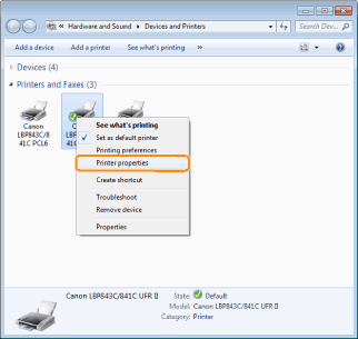 Right-click the icon for the printer, and then select [Printer properties] or [Properties] from the pop-up menu.