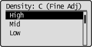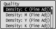 When adjusting the toner densityAdjusting the toner density little by little, print the defective print data from the computer, and then check the printout results. If you cannot adjust the toner density, reset the density to the default value "0", and then contact your local authorized Canon dealer. When [Toner Save] is enabledThis setting is unselectable. Disable [Toner Save], and then perform the following procedure. |