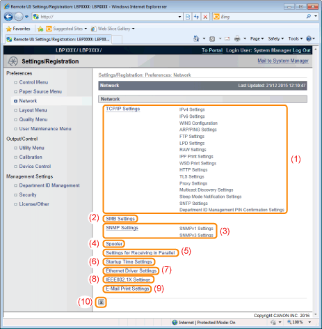 (12) | [Service Management Service] (LBP843Cx only)It displays the SMS (Service Management Service) screen. |
