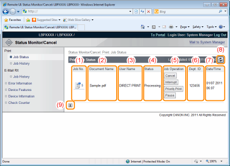 (2) | [Document Name]The name of the job is displayed. For e-mail printing jobs, the subject of the e-mail is displayed. |