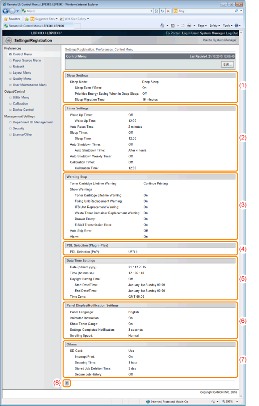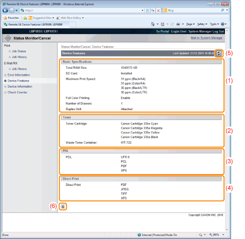 (1) | [Device Basic Information]The basic information about the printer is displayed. |