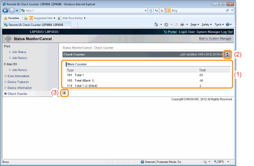 (1) | [Main Counter]The number of pages printed for each counter is displayed. |