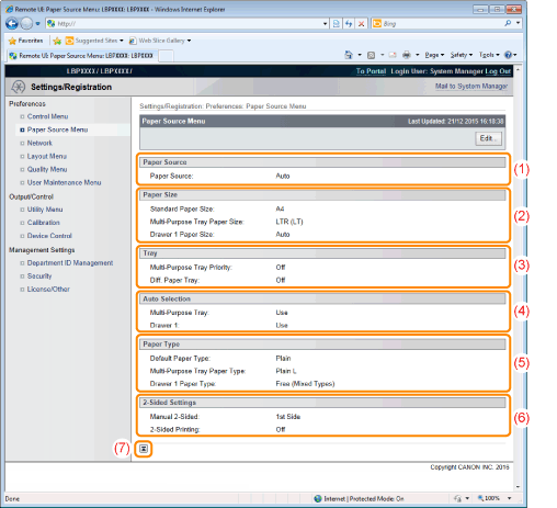 (4) | [Auto Selection]It displays whether to recognize the paper source for auto selection when [Auto] is set for [Paper Source] for each paper source. |