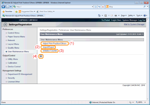 (3) | [Initialize Counter]It displays the settings for resetting the counter, which is carried out after the fixing unit or ITB unit is replaced. |