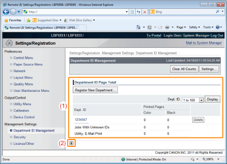 (1) | [Department ID Page Total]It displays the number of pages printed by each department. |