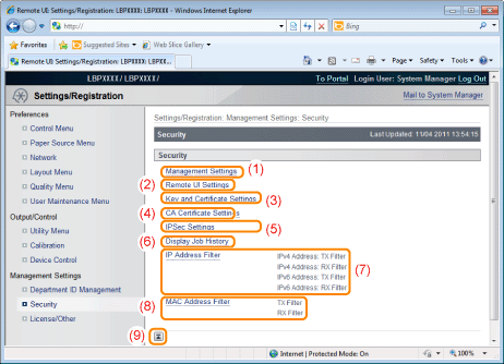 (2) | [Remote UI Settings]It displays whether the Remote UI is set to use the TLS encrypted communication function.