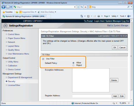 If you select [Allow], you will only be able to transmit or print from users (clients) entered in the [Exception Addresses] field.