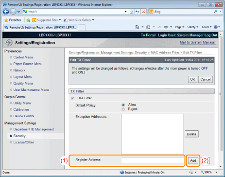 (1) | Enter the MAC address of a device of which you want to permit to access. | Enter the address without placing a hyphen (-) between characters, like AABBCCDDEEFF. |