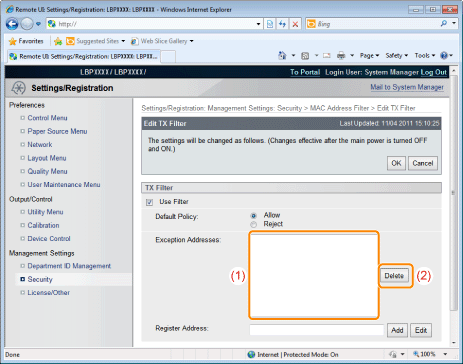 When deleting a set MAC address(1) | Select a MAC address you want to delete. | (2) | Click [Delete]. |
