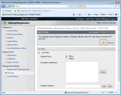 Always use the Remote UI to specify the MAC address. The control panel allows you only to switch the address filter setting between On and Off.