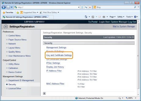 Displaying the [Key and Certificate Settings] Page in the Remote UI