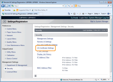 Displaying the [CA Certificate Settings] Page in the Remote UI