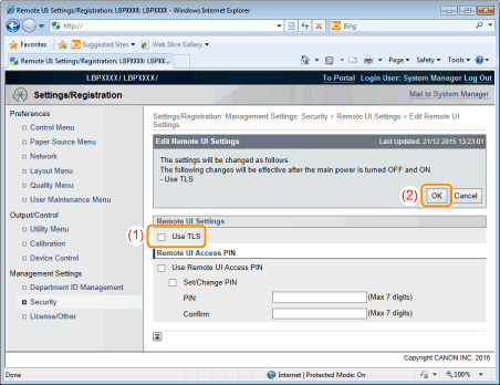 (1) | Select the [Use TLS] check box. | If you clear the check box, the remote UI cannot use TLS encrypted communication. |