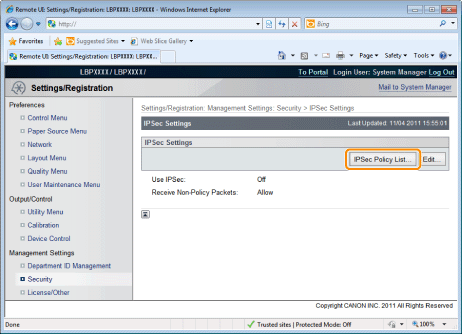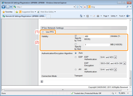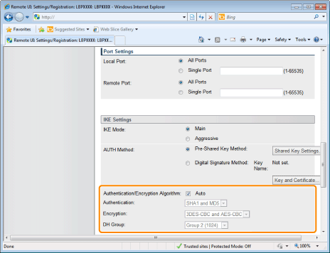 (2) | Select [AUTH Method]. If you want to specify [Pre-Shared Key Method]a. Select the [Pre-Shared Key Method] check box. b. Click [Shared Key Settings]. c. Enter the name of the shared key (up to 24 characters), and then click [OK]. If you want to specify [Digital Signature Method]a. Select the [Digital Signature Method] check box. b. Click [Key and Certificate]. c. Select the key to use, and then click [Default Key Settings]. |