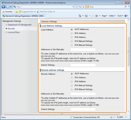 192.168.0.0/16 fe80::0000/64 | In order to specify the subnet range (prefix length), enter a "/" (slash) after the normal IP address symbol, and then enter another prefix length (maximum 32 for IPv4 and maximum 128 for IPv6). |