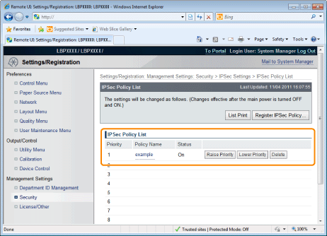 Click [Raise Priority] or [Lower Priority] for the security policy whose priority you wish to change, and change the priority.