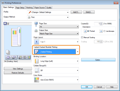 The default setting for [1-sided/2-sided/Booklet Printing] is [2-sided Printing]. You can also change the default setting to [1-sided Printing]. For instructions on changing the default settings, see " Configuring the Default Print Settings." |