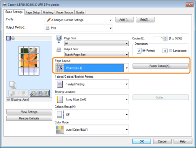 Poster Printing can be selected under the following conditions: [1-sided Printing] is selected from [1-sided/2-sided/Booklet Printing] in the [Finishing] tab. For details, see "1-sided Printing and 2-sided Printing." |
