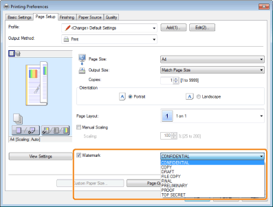 You can register up to 50 watermarks, not including the watermarks already provided. The display may vary according to the operating system, as well as the type and version of the printer driver. |