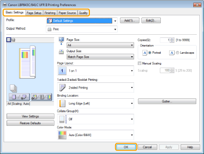 Click the tabs for the [Basic Settings], [Page Setup], [Finishing], [Paper Source], and [Quality] tabs, and then specify the desired items.