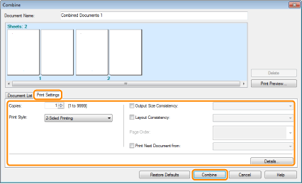 If you want to edit the print settings of the combined file, click [Print Settings] → specify the desired settings → click [Combine].