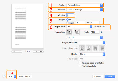 The displays may differ between operating systems, printer driver types, and functions. For Mac OS X 10.7 and later users, click [Show Details]/[Hide Details] at the bottom of the screen to show/hide options. For Mac OS X 10.5/10.6 users, click [ ] to the right of [Printer] to show/hide options.If the above functions cannot be set in the upper part of the [Print] dialog box, display and set them in the [Copies & Pages] preferences pane or the [Page Setup] dialog box. |