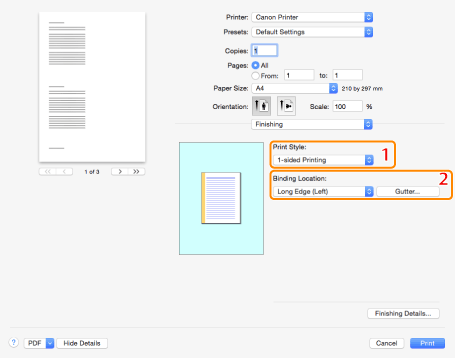 1.1-sided/2-sided Printing | Prints on one or both sides of the paper. The default setting for [Print Style] is [2-sided Printing] (see "1-sided and 2-sided Printing"). | 2.Binding Location/Gutter | Sets the orientation and width of the gutter. |