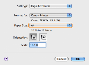 Depending on the printer model you are using, you may not be able to magnify the document to the optimum ratio for the selected page size. In Mac OS X 10.5.x, the [Page Setup] dialog box may not be displayed, depending on the application you are using. If this is the case, you can specify the page size, page orientation, and scaling in the [Print] dialog box. For details about how to display the [Print] dialog box, see " Printing." The screen may vary according to the operating system, as well as the type and version of the printer driver. |