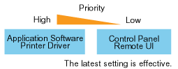 When the setting values for the same item are different between an application or the printer driver and the menu functions, the setting specified in the application or printer driver is effective. When specifying an item only in the menu functions using the control panel or the Remote UI, the most recently specified setting is effective.