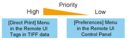 The direct print function gives priority to the contents specified using the [Direct Print] menu in the Remote UI or tags in IFD (Image file directory) that the header of TIFF data of image file has over those specified using the control panel or the [Preferences] menu in the Remote UI.